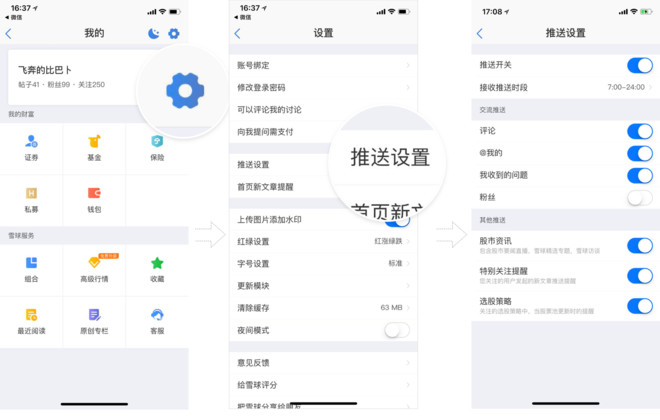 推送设置:主要是选择雪球App什么时候可以向你推送内容,以及选择接受什么样的内容
