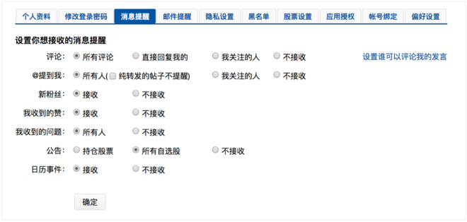 1)在雪球web的个人主页上点击右上角小闹钟图标,进入消息『提醒设置』