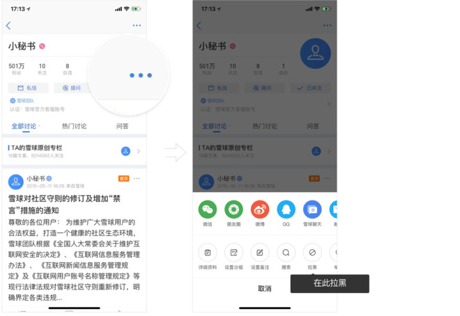 在雪球,如果你不想看某个用户的发言、不想被其干扰,可以选择将其加入你的“黑名单”(以下简称拉黑),步骤如下: