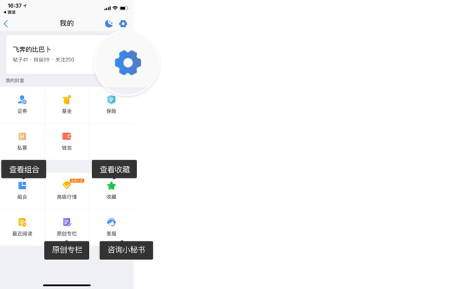 2)“我的”页面右上角点击“齿轮”进入个人账号设置。
