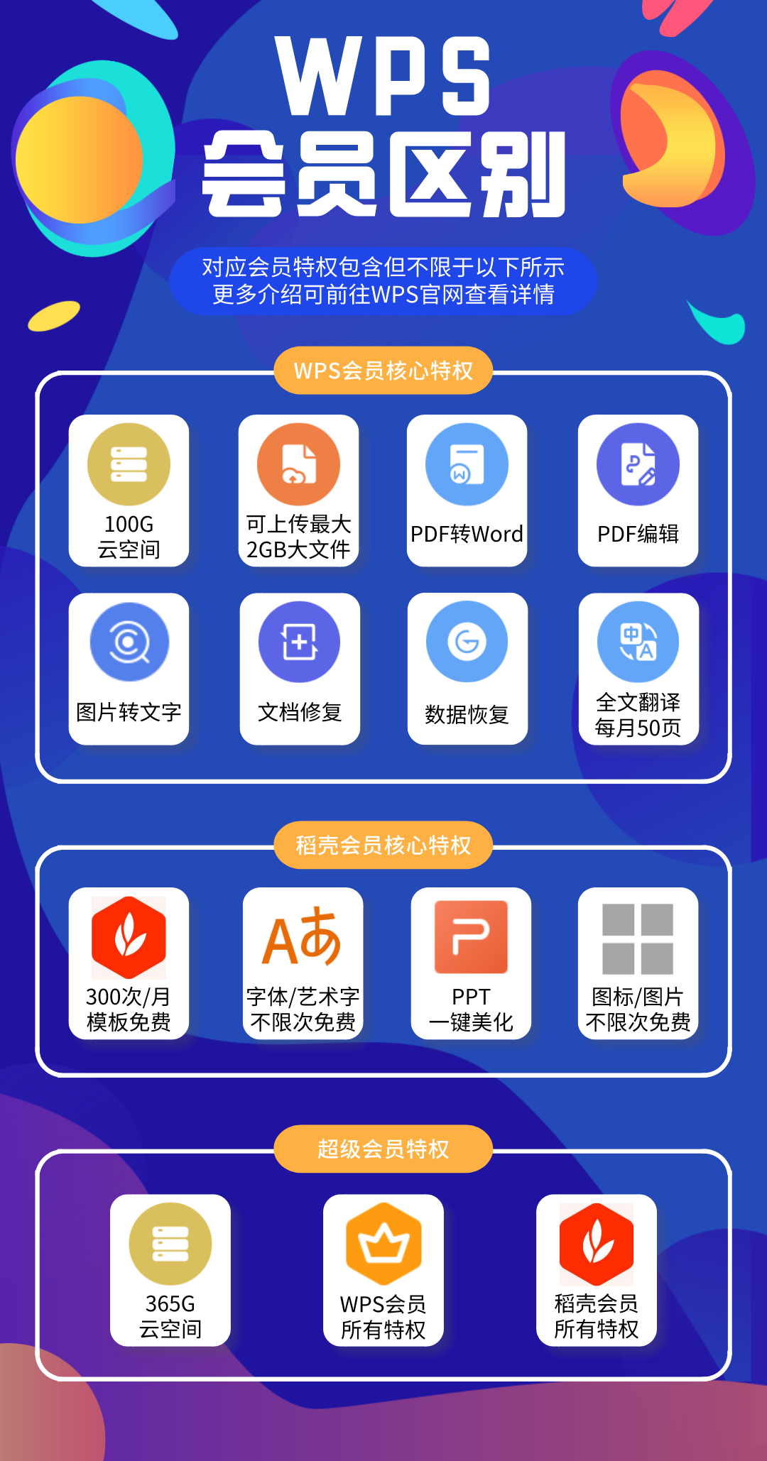 您好,目前WPS会员共分为如下三种:(更详细会员特权介绍可点击此处)