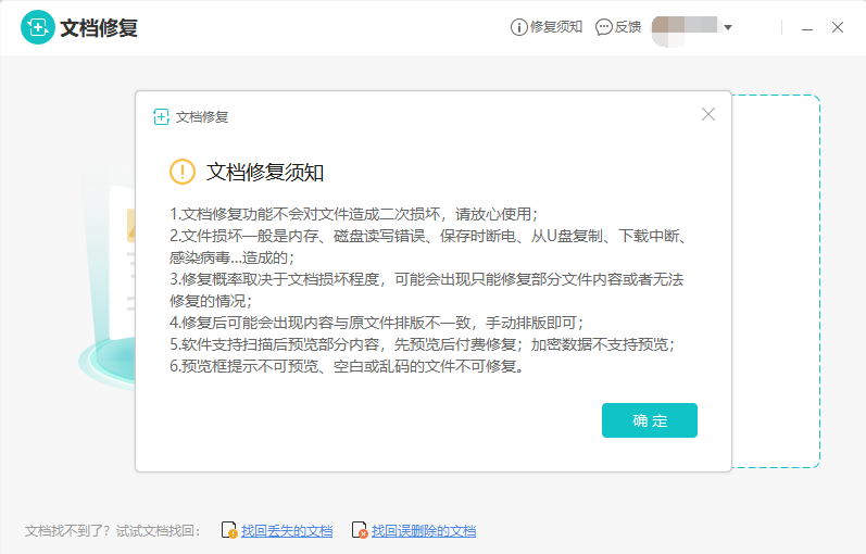 文档修复的成功与否,根据文件损坏程度决定。如果文件损坏严重,不排除无法修复的情况。(文档修复窗口下方“温馨提示”有明确说明)