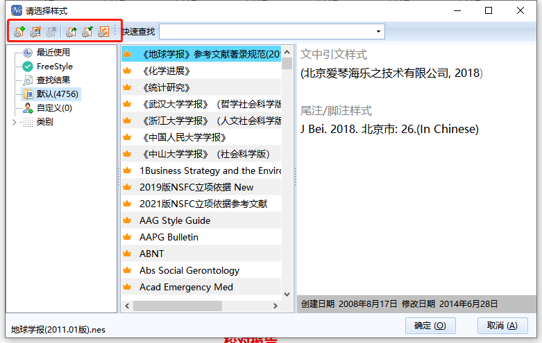 您还可以在引文样式下拉菜单中点击【选择其他样式】打开更详细的引文样式展示弹窗,在此弹窗上进行自定义新增引文样式,编辑既有样式,以及导入导出引文样式等操作。