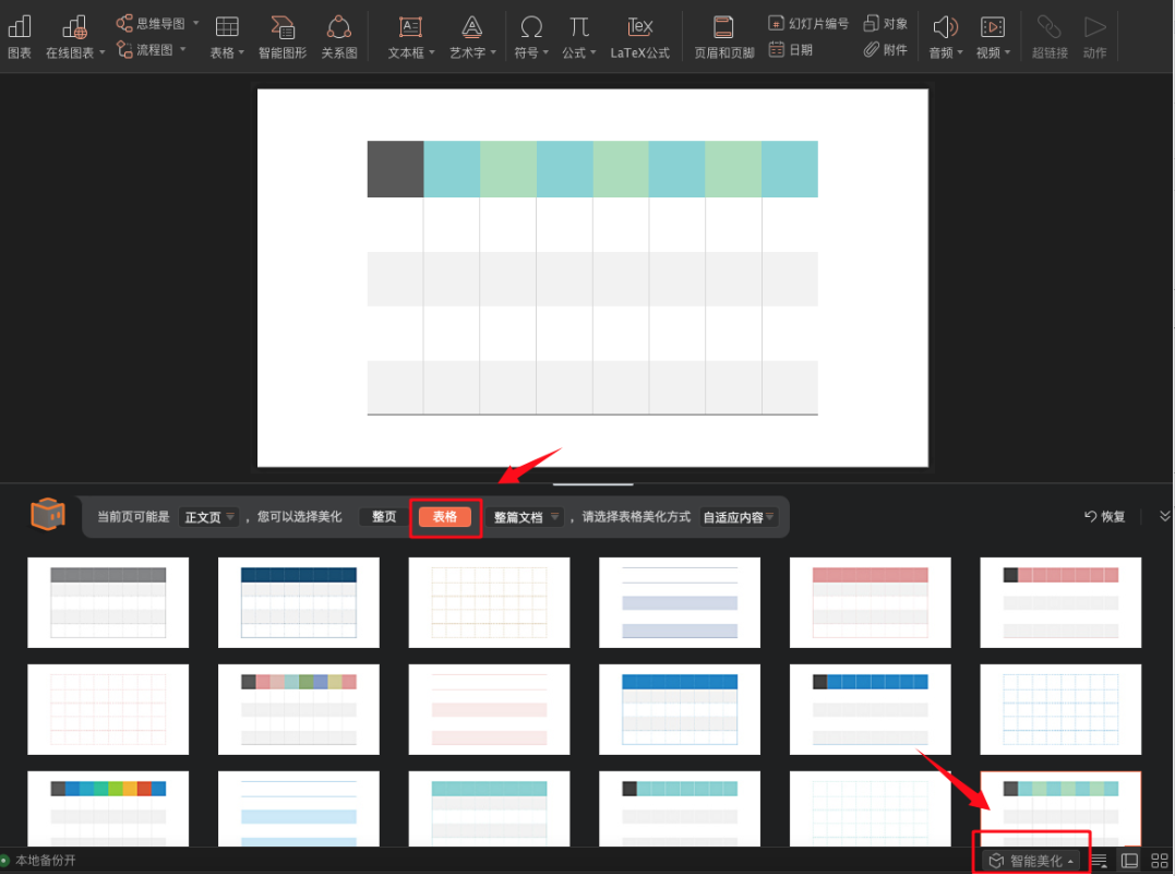 目前WPS Office for Mac3.7.0已经升级美化功能,建议您可以升级到此版本体验下,升级成功后您可以点击右下角智能美化-表格,直接使用表格美化即可(如下图)。