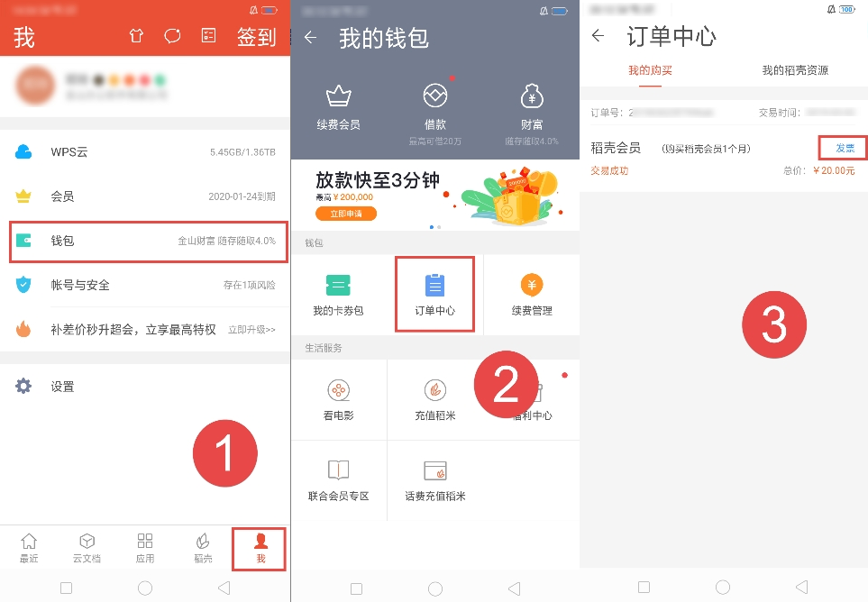 打开手机WPS,找到我----钱包----订单中心点击进去,点击「发票」,进去按照提示填写信息后下载。「目前仅支持开具近三个月的发票」