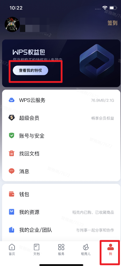 移动端可在WPS顶部点击“我"进入到个人中心-点击顶部卡片进行查看